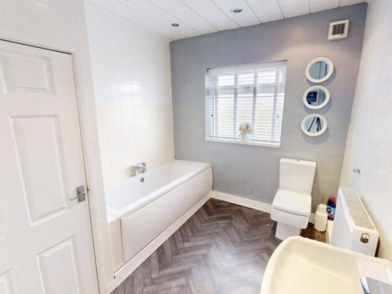 The main bathroom includes a full-size bath with an over-bath shower, perfect for both a relaxing soak or a quick refresh. It also contains a toilet and washbasin, with ample space and good lighting for everyday ease.