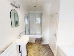 The main bathroom includes a full-size bath with an over-bath shower, perfect for both a relaxing soak or a quick refresh. It also contains a toilet and washbasin, with ample space and good lighting for everyday ease.
